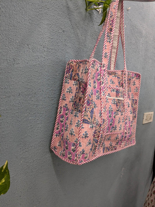 Cotton handmade block print bag, patchwork quilted bag, tote Large travel bag, Quilted Tote Bag, Quilted Cotton Tote bag With Zipper